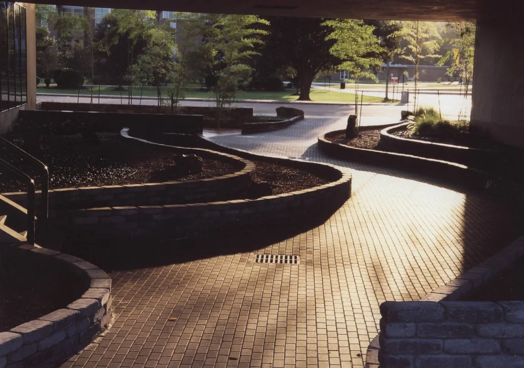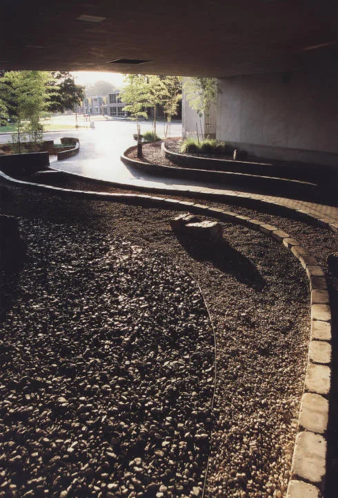 A 'cave' concept was developed to simulate a naturally-occuring, water-carved tunnel. Vegetation was planted and boulders were strewn around the entrances. The retaining walls were arranged in fluid curvilinear forms to represent the water that carved the space. The retaining walls are seat height with each wall rising above the next. Each band features different aggregate materials of varying size and color.