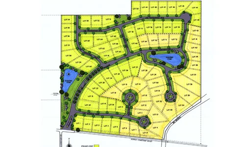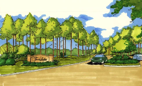 Our office provided entry planning for this residential development, as well as phasing studies for use by the developer. Entry signage was designed, and the landscape plan included extensive street-tree plantings to help establish a continuity throughout the development. Extensive 3-D modeling was used to establish the perspectives shown in the hand-drawn promotional image.